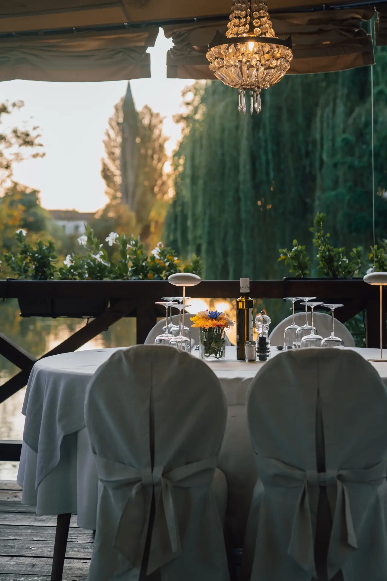 Sulle acque quiete della Riviera del Brenta, i tavoli elegantemente apparecchiati riflettono la luce morbida del tramonto, mentre il mormorio del fiume accompagna ogni sorso e ogni boccone.